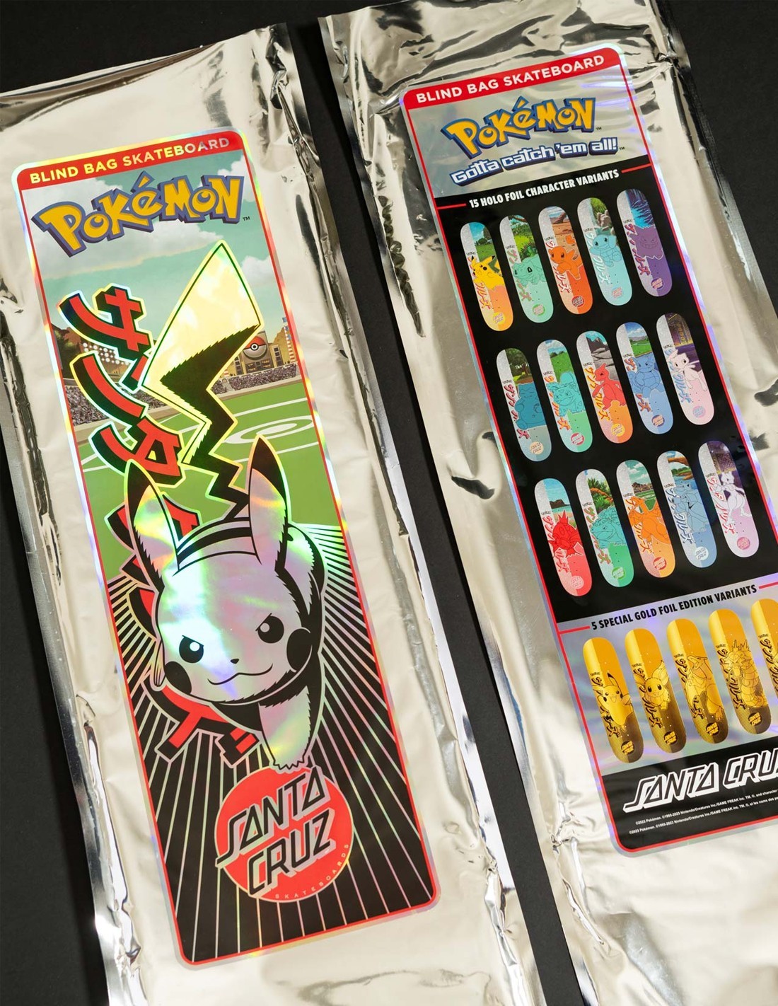 La "bling bag" (bolsa opaca) está precintada y contendrá aleatoriamente una tabla de SANTA CRUZ de las siguientes 15 icónicas calcomanías Holo Foil de Pokemon: