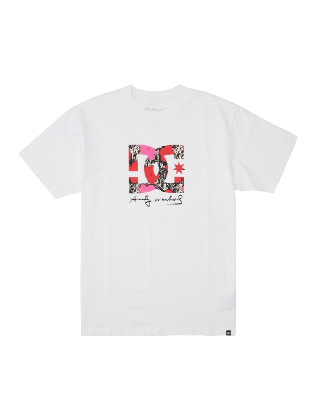 - DC logo met Andy Warhol gebloemde kunstvulling en Andy Warhol handtekening plastisol opdruk op borst